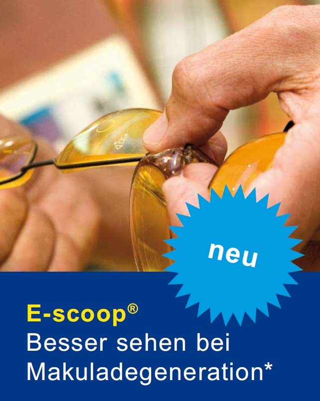 E-scoop® ist ein patentiertes Lupenglas mit einzigartigen Eigenschaften, das speziell für Menschen mit Makuladegeneration entwickelt wurde.
